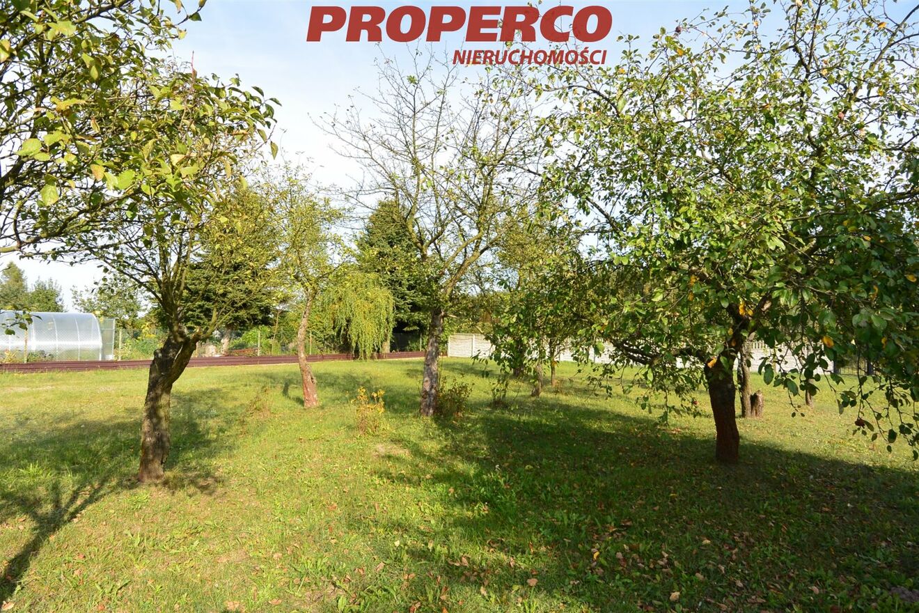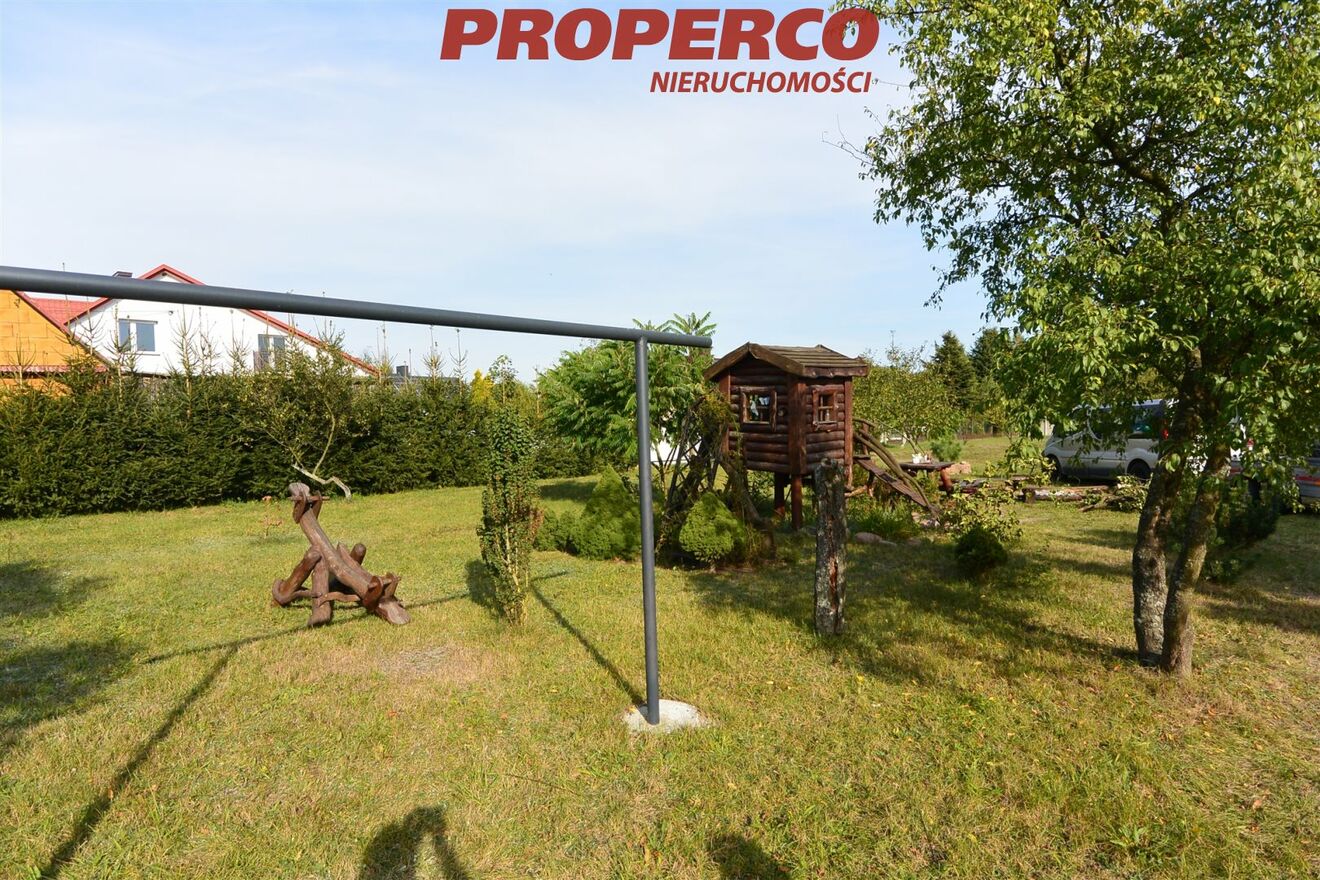 Działka utrzymana w dobrym stanie, trawnik regularnie koszony, w tylnej części rosną wieloletnie drzewa owocowe.